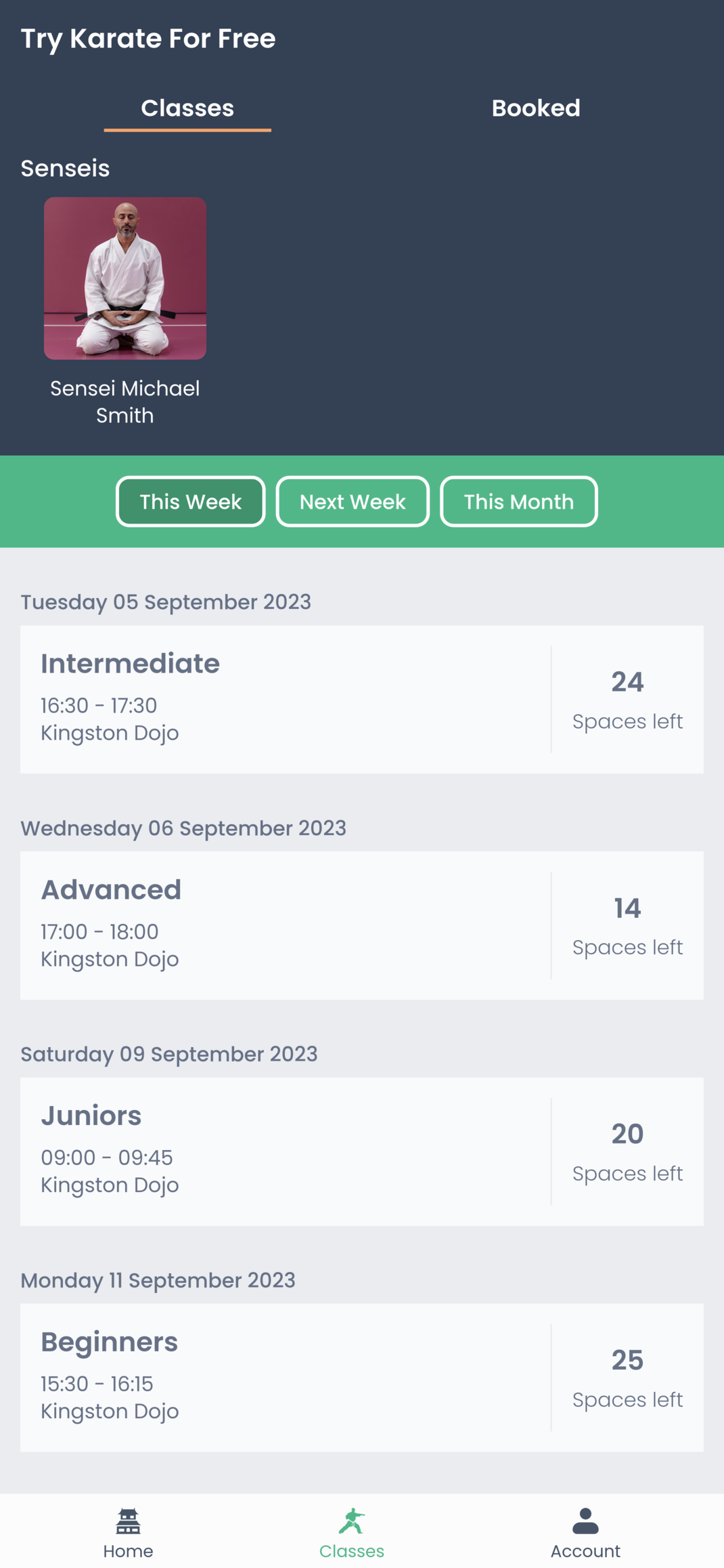 A screenshot of the Mokuso app classes list